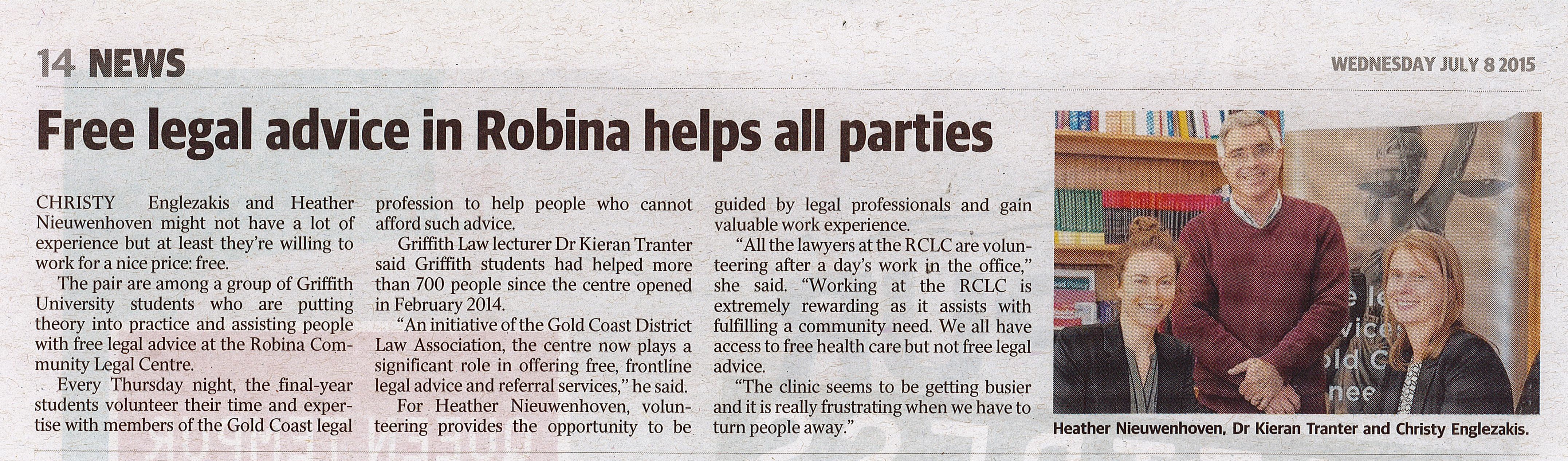 Free Legal Advice – GC Sun Article 10 Jul 2015 | Blog Thanks to Committee member Dr Kieran Tranter and Griffith University Students Heather Nieuwenhoven and Christy Englezakis for arranging a fantastic Gold Coast Sun article about RCLC. Here following is the article, published Wednesday 8 July 2015: