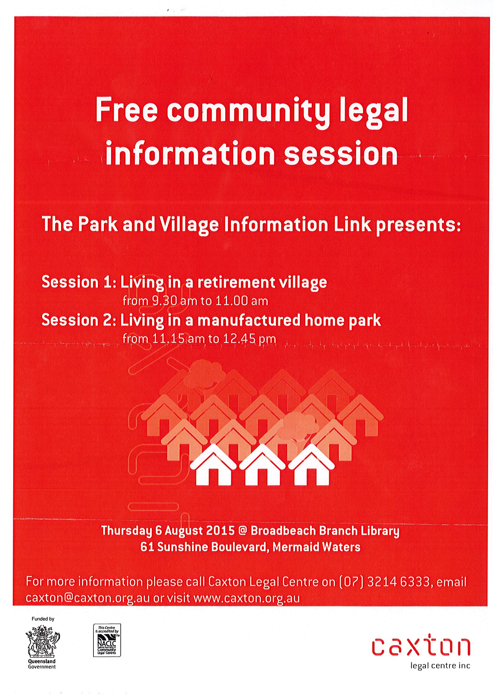 Caxton Legal Centre Inc. is in the process of holding some free community legal information sessions for Park and Village residents in the Gold Coast region. The next one is as follows: